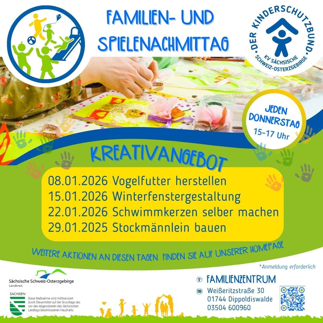 Jeden Donnerstag von 15 bis 17 Uhr laden wir herzlich zum „Familien- und Spielenachmittag“ ein. Bei schönem Wetter treffen wir uns mit dem Spielmobil und jeder Menge Spiel und Spaß auf dem Spielplatz "Polypark" in Dippoldiswalde. Im Winter findet ihr uns in unserem Familienzentrum.